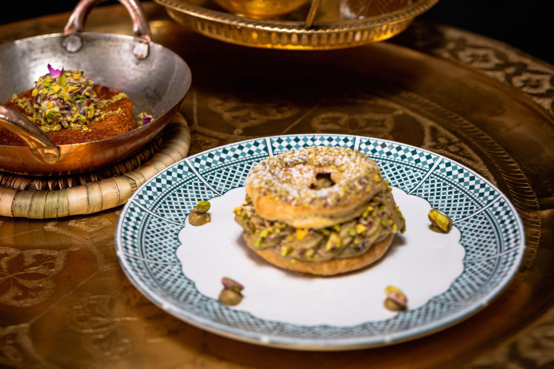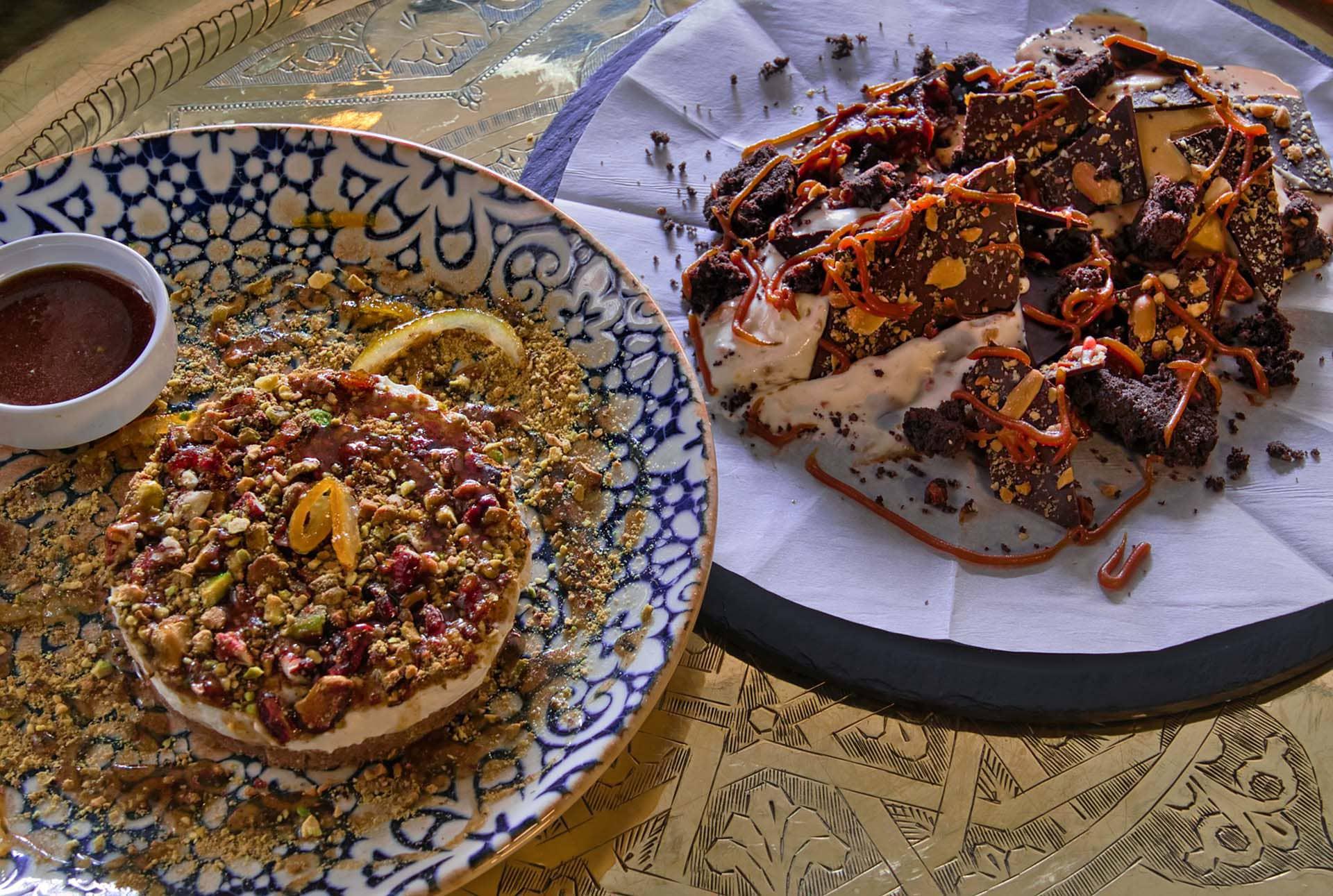 Après un repas savoureux, la carte propose une sélection de douceurs maison qui prolongent l’expérience culinaire. Le Mouhalabia, dessert traditionnel à base de lait parfumé à la fleur d’oranger, ainsi que le soufflé au chocolat, offre une fin de repas gourmande et équilibrée. Ces desserts s’harmonisent parfaitement avec le thé à la menthe fraîche ou un café turc, deux boissons emblématiques qui renforcent l’identité marocaine du lieu.